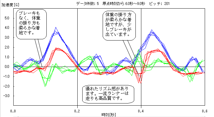 | A.付録 − ランナーの個性を映し出す加速度波形 様々なランナーの加速度波形を付録として紹介します。 図は連続する2歩の波形を複数本、重ねて描いています。 図中、青線は上下方向、緑線は左右方向、赤線は前後方向の加速度を表しています。 ■ 図A-1はスプリンターの腰部加速度波形です。 (100mを11.41秒で走行) ![]() [ 図A-1 ] (注1) 離地すると0[G]になりますが、手足の動きが腰部に反映するので必ずしも0[G]を観測できるとは 限りません。離地する辺りでは上下方向加速度が急激に減少するので、1〜0[G]を離地の目安 としたものです。 ■ 図A-2は箱根の2区を走ったT氏の腰部加速度波形です。(100mを17.49秒で走行) ![]() [ 図A-2 ] ■ 図A-3は5000mの自己ベストが16分30秒台の長身ランナーTB氏の腰部加速度波形です。 ![]() [ 図A-3 ] ■ 図A-4は5000mの自己ベストが18分台のランナーM氏の腰部加速度波形です。 ![]() [ 図A-4 ] ファンダメンタル、リズム、フォームの違いが見えてきませんか? |